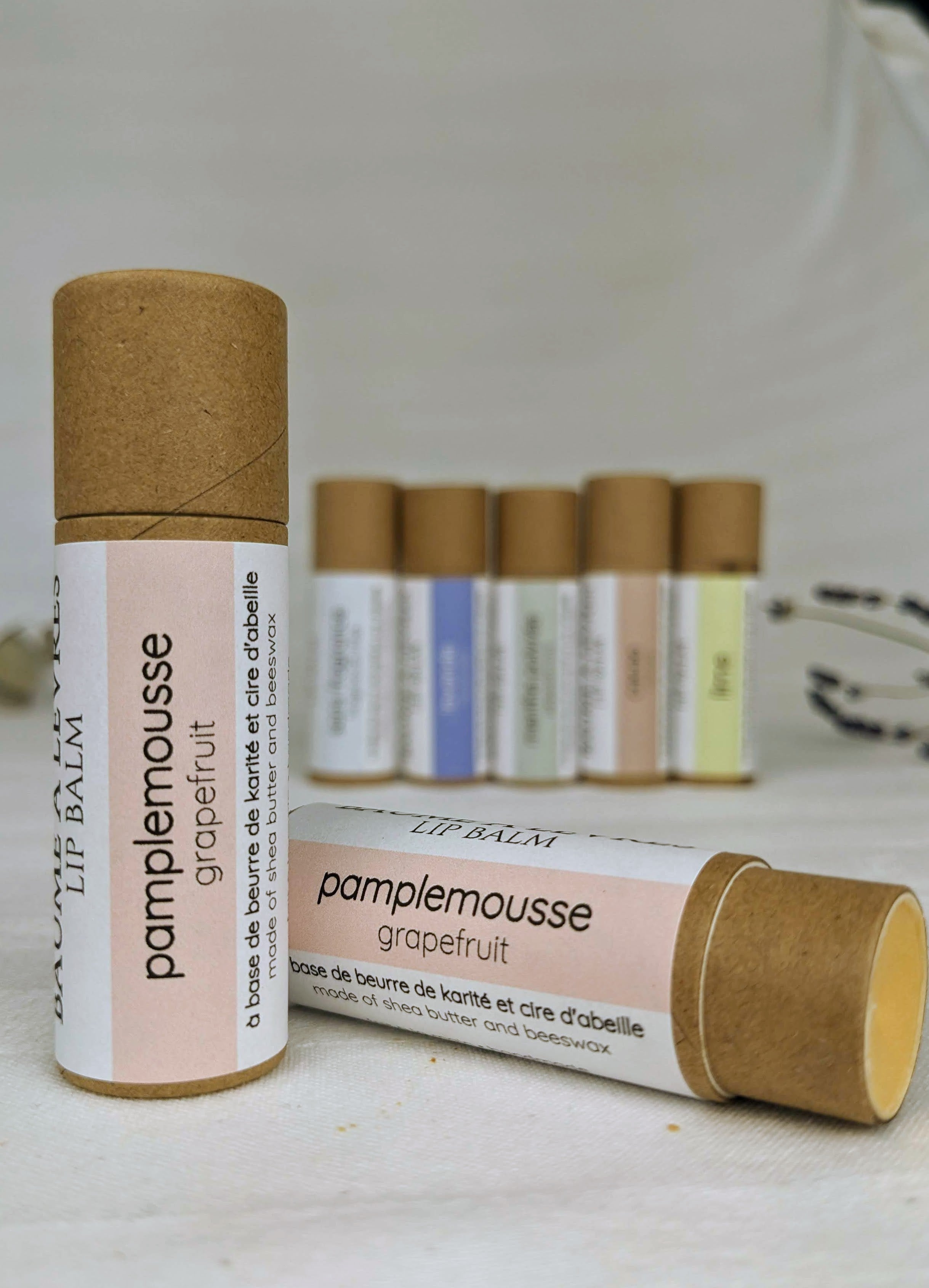 | KEY INGREDIENTS Shea Butter: Deeply moisturizes and nourishes the lips, leaving them soft and supple. Coconut Oil: Helps retain moisture and provides a protective barrier against environmental stressors. Beeswax: Locks in moisture and shields the lips from harsh elements, preventing dryness and chapping. Grapefruit Essential Oil: Adds an uplifting scent, and antioxidant benefits to lip balm. PACKAGING Our Moisturizing Grapefruit Lip Balm comes in a cardboard biodegradable tube. It's a convenient and travel-friendly tube, allowing you to easily carry it wherever you go. HANDMADE IN Saint-Mathieu-de-Beloeil, Québec, Canada FORMAT 12 g | DESCRIPTION This Grapefruit Lip Balm is made with natural, luxurious ingredients including shea butter, coconut oil, beeswax, and grapefruit essential oil. Pamper your lips while caring for the environment. Let its moisturizing effect nourish and protect your lips all day. Our large size will keep your lips moisturized twice as long as other balms, and the ecofriendly packaging is kind to the environment. BENEFITS AND FEATURES | ||